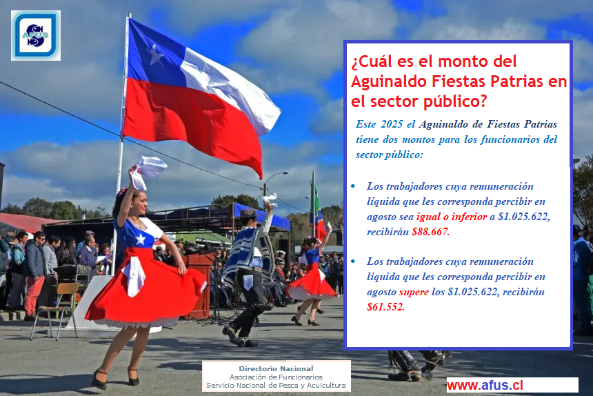 Este 2025 el Aguinaldo de Fiestas Patrias tiene dos montos para los funcionarios del sector público:Ø   Los trabajadores cuya remuneración líquida que les corresponda percibir en agosto sea igual o inferior a $1.025.622, recibirán  $88.667.   Ø   Los trabajadores cuya remuneración líquida que les corresponde percibir en agosto supere los $1.025.622, recibirán $61.552.
