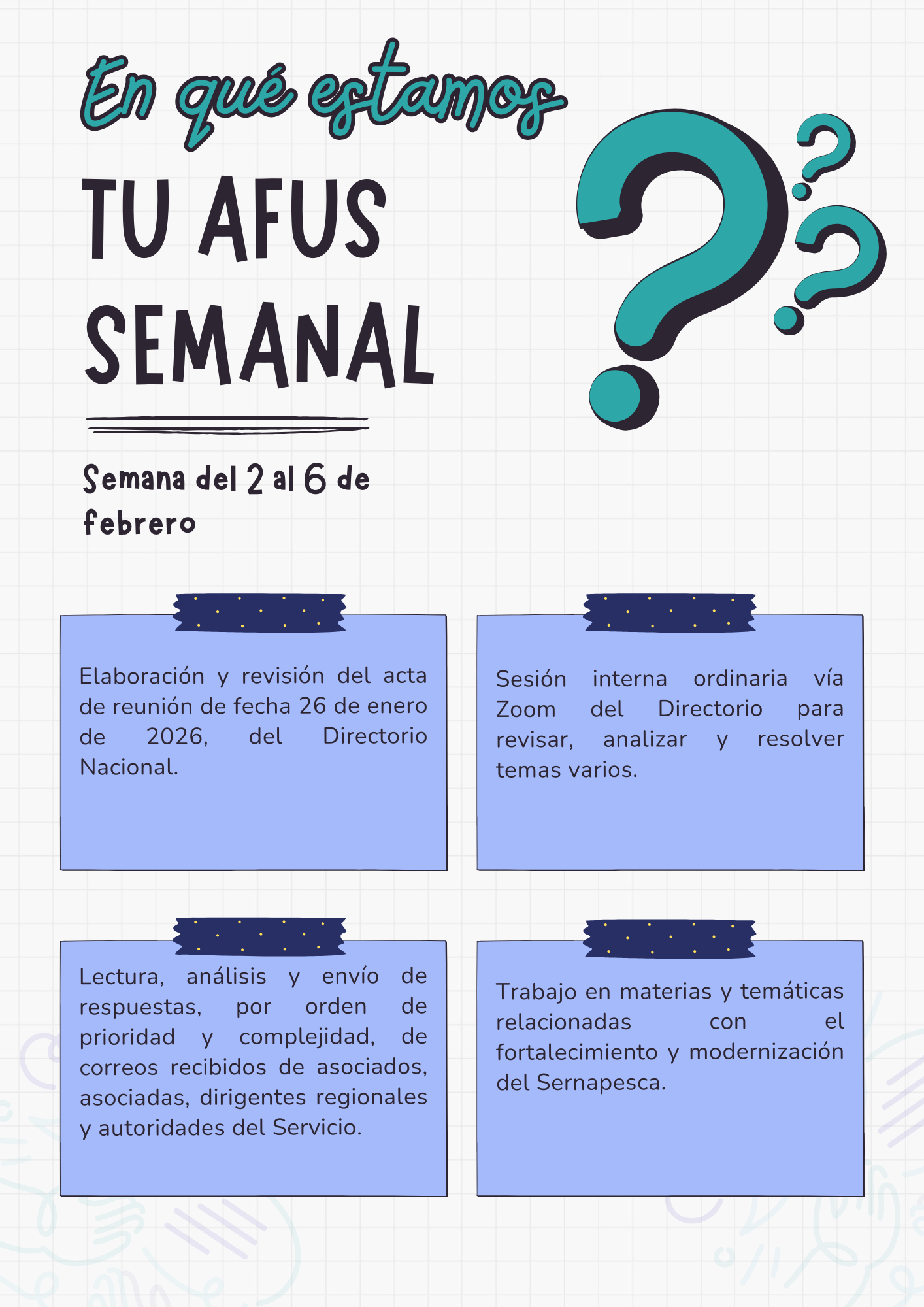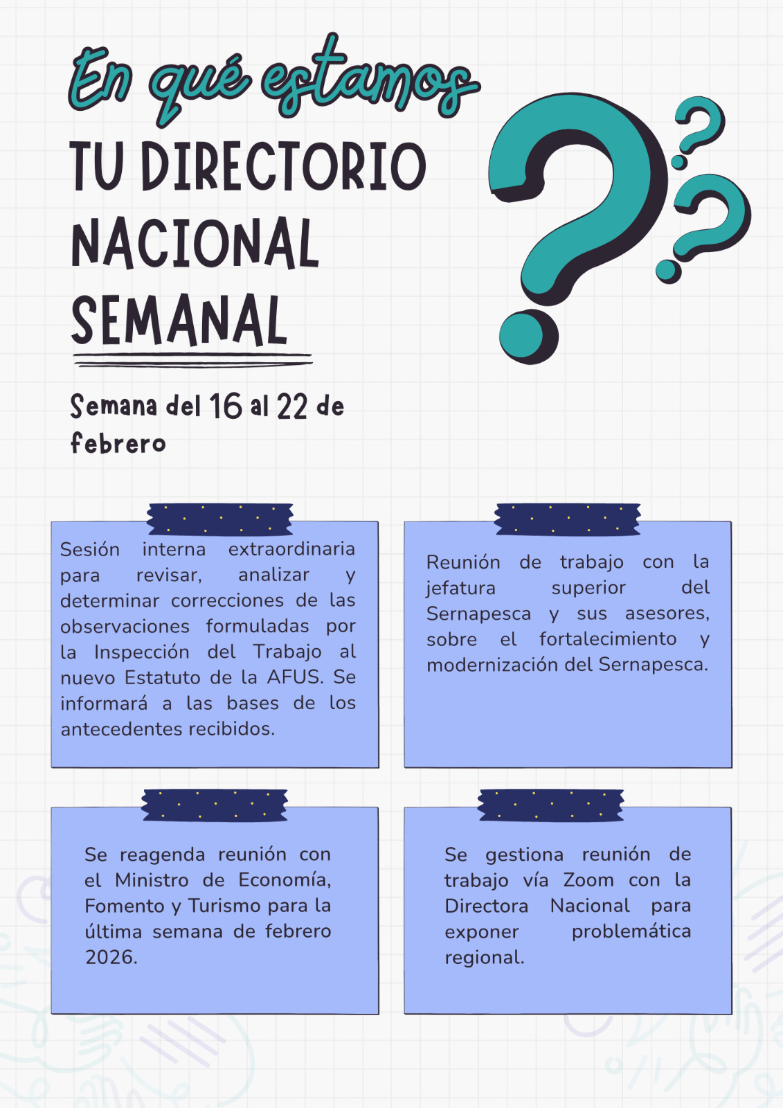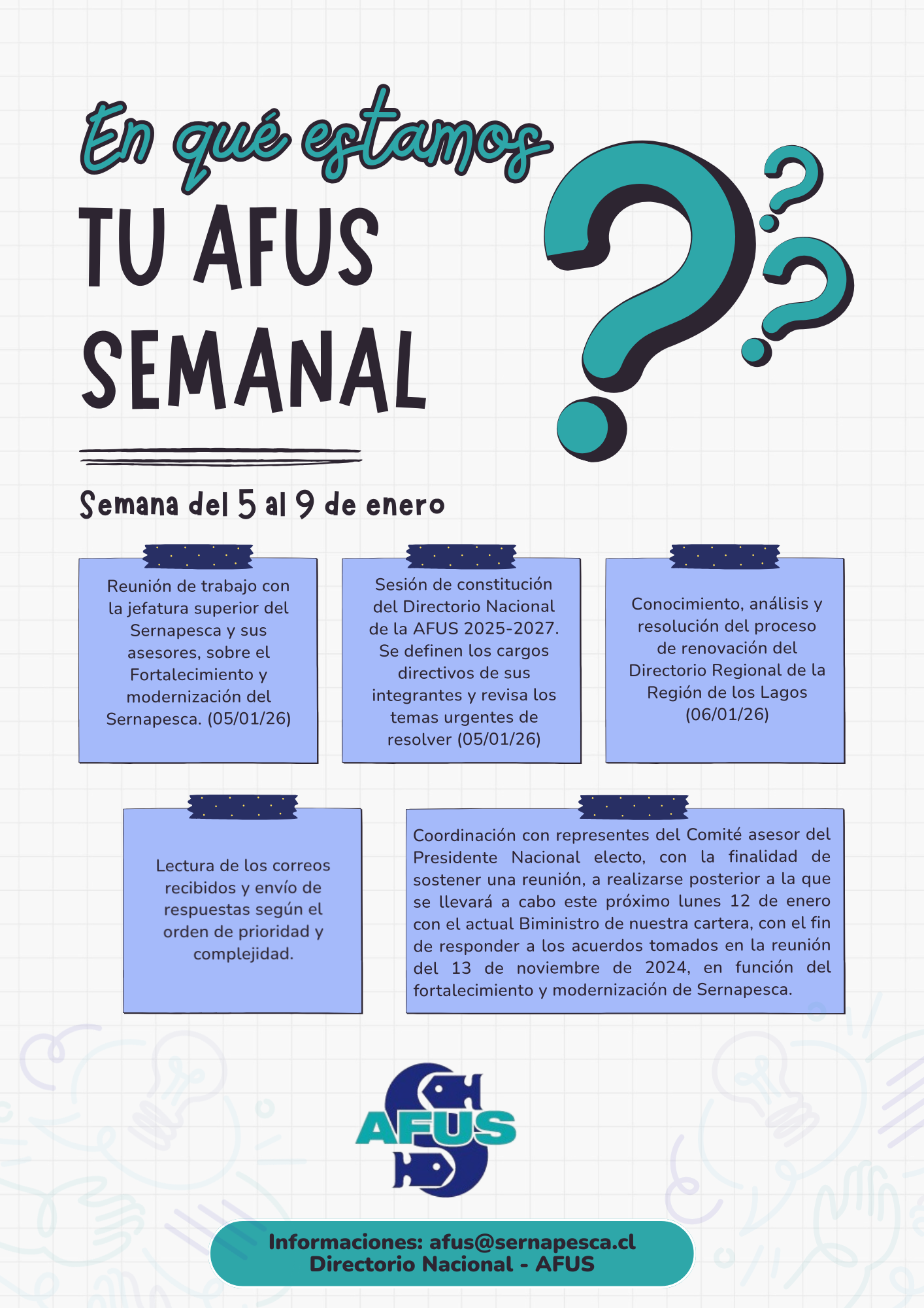 Estimados/as Asociados/as de AFUS: En mi calidad de Secretario Nacional de la Asociación de Funcionarios del Servicio Nacional de Pesca y Acuicultura – AFUS, tengo a bien comunicar a Ustedes, que se inicia el proceso para la elección de Dirigentes Nacionales, periodo 2020-2021. Teniendo presente lo dispuesto en los actuales Estatutos de la Asociación de Funcionarios del Servicio Nacional de Pesca y Acuicultura, debemos considerar lo siguiente: 1.   La Fecha del Acto...