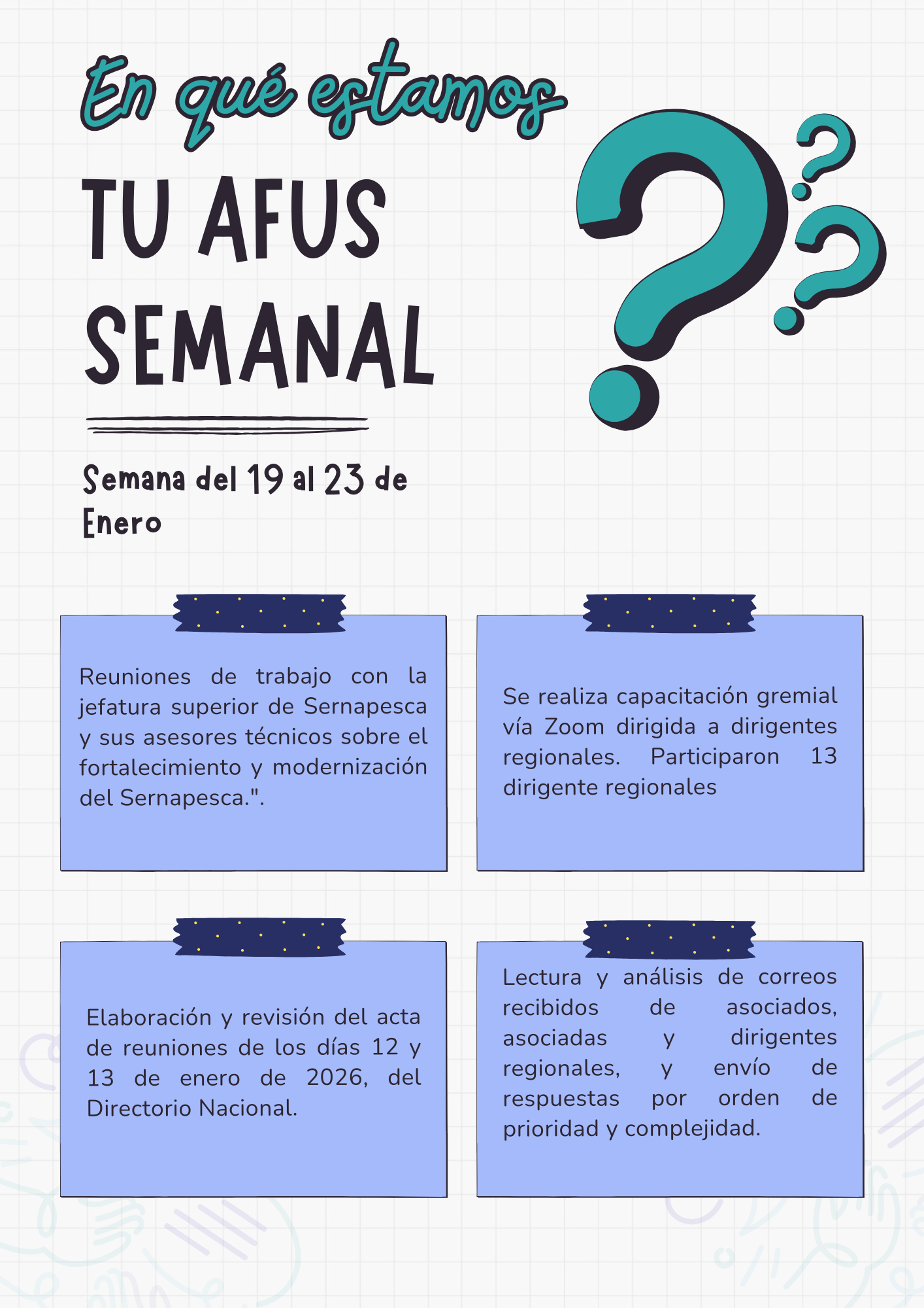 Asociación de Funcionarios del Servicio Nacional de Pesca y AcuiculturaPARO Nacional de 48 horasEl Directorio Nacional de la AFUS, informa que nuestra Organización se adhiere a este llamado a PARO NACIONAL de 48 horas convocado por la Mesa del Sector Público para los días martes 19 y miércoles 20 de Noviembre, ante la nula respuesta del Gobierno a las demandas entregadas el pasado mes de Octubre. Así mismo, mantenemos un irrestricto apoyo a las demandas de la ciudadanía que aún no son in...
